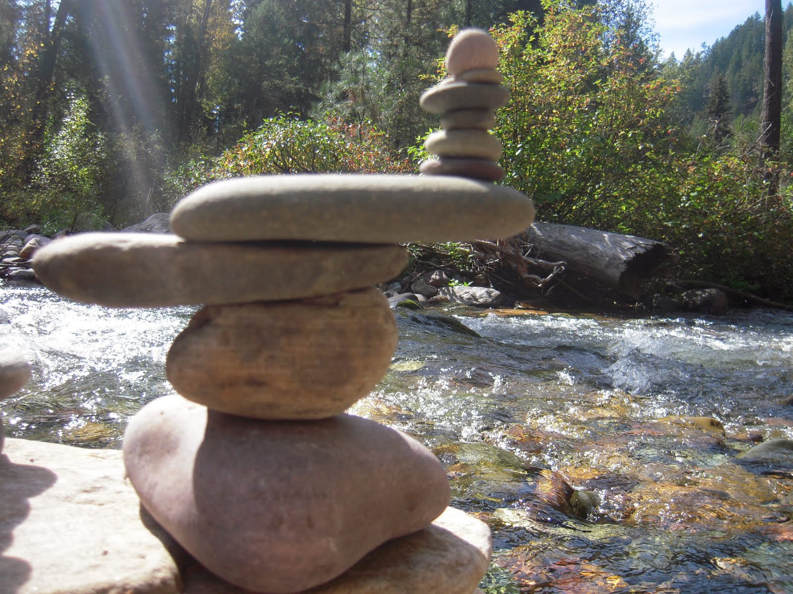 Today, because Corin's school was out and Seth's was in, I had a rare solo day with my elder boy. These days Corin is interested in adventures, and though the gang of boys in the adventure stories to which he likes to listen happen to find buried treasure or rescue kidnapped children every second day, adventures like that in our quiet valley are a bit hard to come by. Undaunted, we set off for the Rattlesnake, equipped with his adventure necklace (lanyard, compass, two golden pens, one tiny swiss army multi-tool) some sandwiches and our current chapter book. Corin wanted to go back to the spot we'd visited as a family, whiling away this past Saturday afternoon. On the riverbank we'd stacked rock cairns in a rash of spontaneous construction. The rock piles were beautiful and oddly graceful. And we both wanted to see them again, so we didn't mind that our adventure carried us down a path we had recently trod. This time, however, Corin paused every twenty feet to lay stick arrows in the trail, just in case any other adventurers wanted to follow our lead. Arriving at our spot, we were pleased to find the rock sculptures had weathered the intervening days, and I was particularly happy to see a few spiders had been busy launching lines among them, their thin filaments catching and keeping the light.